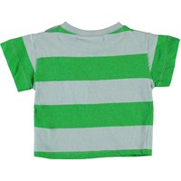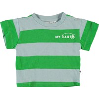 Enzo ist ein gestreiftes Baby-T-Shirt in Grün und Blau mit 'My Earth' Druck. Emmett hat einen Knopf im Nacken, der es leicht macht, das T-Shirt ab und an zu bekommen. Zum T-Shirt gibt es passende Hosen.