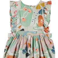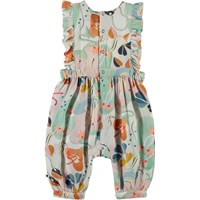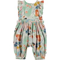 Fallon ist ein ärmelloser Babyanzug mit einer Rüschenkante an den Schultern. Der Anzug ist mit pastellfarbenem Druck. Druckknöpfe im Nacken und zwischen den Beinen erleichtern das An- und Ausziehen des Anzugs.