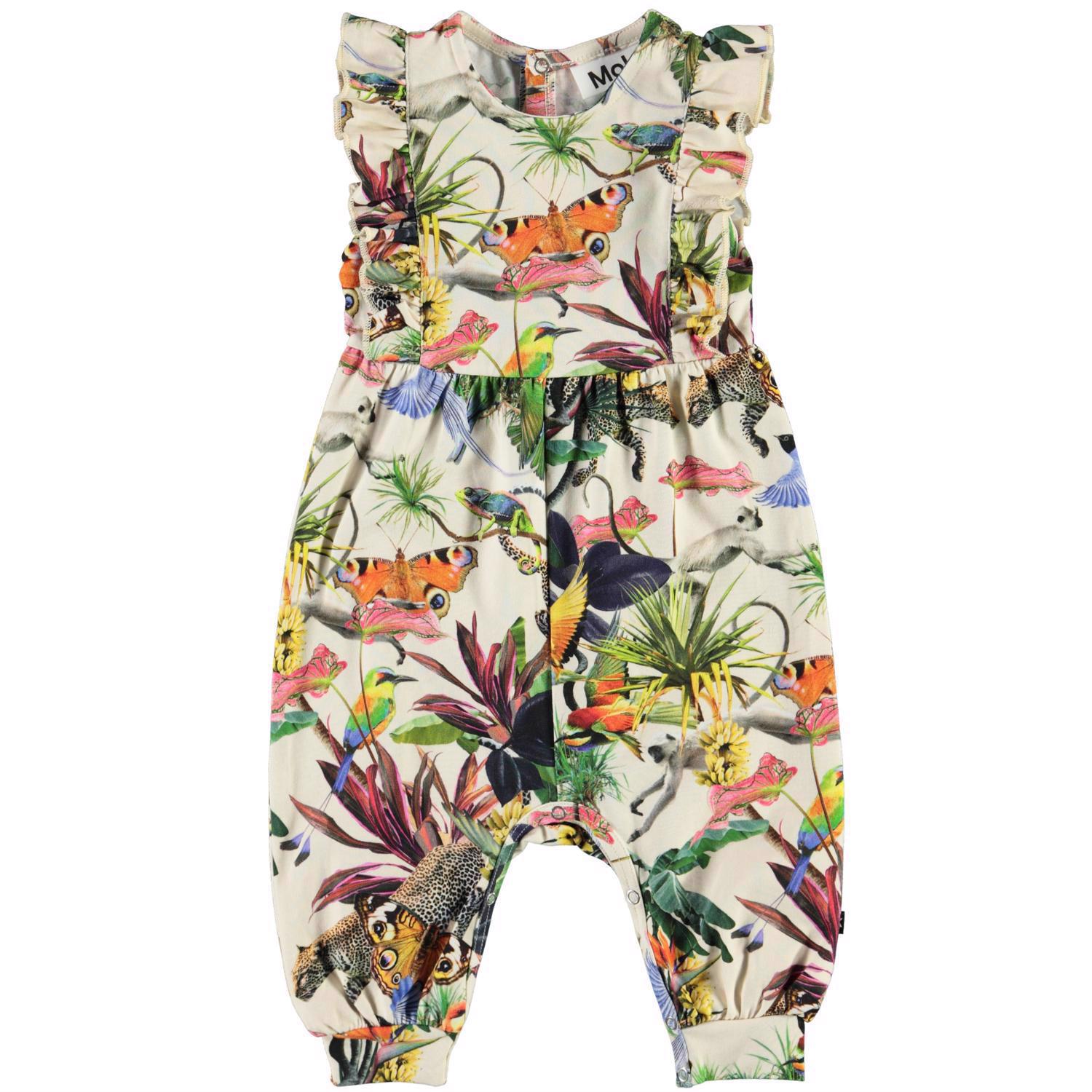 Fallon ist ein ärmelloser Babyanzug mit Rüschenkante an den Schultern. Der Anzug ist in einem feinen Print mit schönem bunten Fantasy-Dschungel gefertigt. Druckknöpfe im Nacken und zwischen den Beinen erleichtern das An- und Ausziehen des Anzugs.