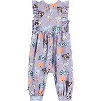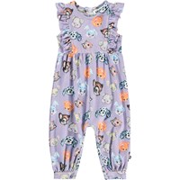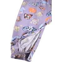 Lila Strampler für die Kleinsten aus weicher Öko-Baumwolle ohne Ärmel und mit einem Druck von bunten Cartoon-Tieren. Der Strampler hat eine Rüsche, eine lockere Passform mit Druckknöpfen am Hals und zwischen den Beinen für einfaches Anziehen.