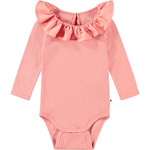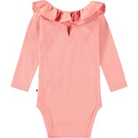 Korallenfarbener Langarm-Body aus gerippter Öko-Baumwolle. Der Body hat einen süßen Popeline-Kragen, der über die Schultern reicht. Er hat Druckknöpfe am Rücken und zwischen den Beinen, was das An- und Ausziehen erleichtert.