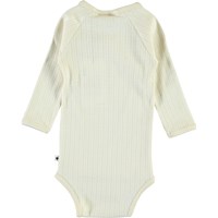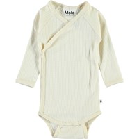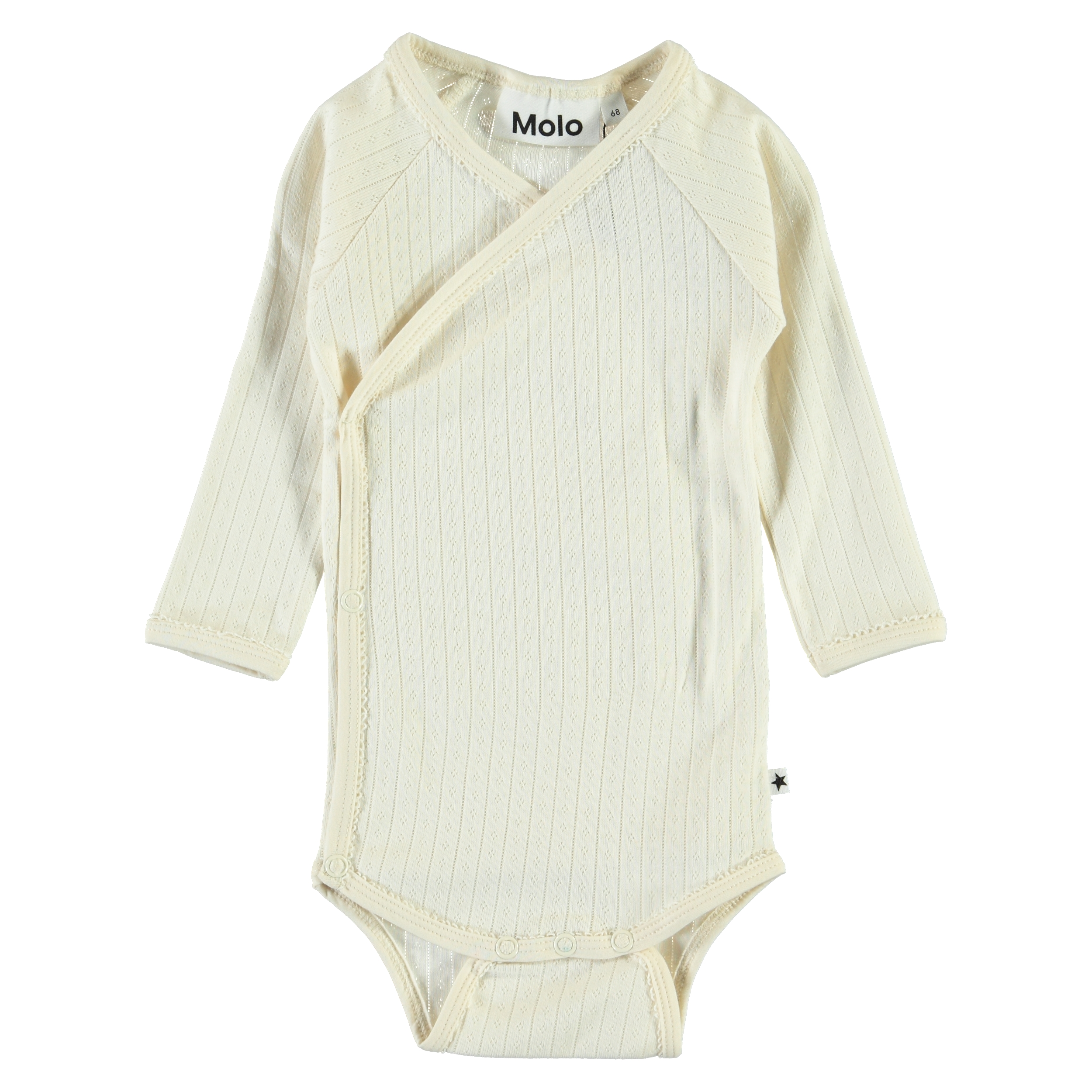 Faye ist ein Babybody mit feinem Hohlmuster und langen Ärmeln. Der Body hat einen schrägen Verschluss über der Vorderseite mit Druckknöpfen sowie Druckknöpfen zwischen den Beinen, wodurch das An- und Ausziehen erleichtert wird.