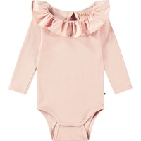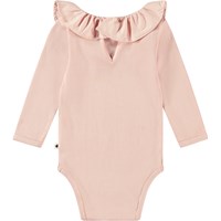 Pulverfarbener Langarm-Body mit niedlichem Popeline-Kragen aus gerippter Öko-Baumwolle. Er hat Druckknöpfe am Rücken und zwischen den Beinen, was das An- und Ausziehen erleichtert.