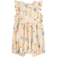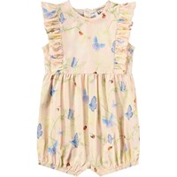 Rosa Strampler für die Kleinen aus Bio-Baumwolle mit Schmetterlingsdruck. Er ist ärmellos, mit feinen Rüschendetails, kurzen Beinen mit Gummizug und einer lockeren Passform für optimale Bewegungsfreiheit. Leicht mit Druckknöpfen am Rücken und zwischen den Beinen zu schließen, was ihn perfekt für warme Tage macht.