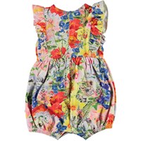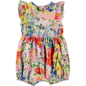 Felicia ist Molos neuer Baby-Anzug, der perfekt für die wärmeren Tage ist. Der Anzug hat einen Blumen-Druck, in dem sich verschiedene Tiere zwischen den Blumen verstecken. Felicia hat Rüschen auf der Vorderseite und Knöpfe im Nacken und zwischen den Beinen, die das an- und ausziehen einfach machen. Ecocert Greenlife, certifikationsnr. 197496.