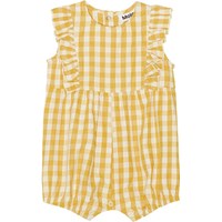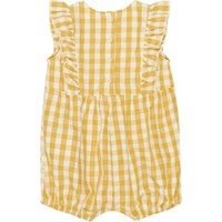 Karierter Overall in Weiß und Maisgelb mit feinen Rüschen auf der Vorder- und Rückseite. Der Overall ist ärmellos, hat kurze Beine mit Gummizug und Druckknöpfen in der Mitte des Rückens und zwischen den Beinen, die das An- und Ausziehen erleichtern. Der Anzug ist locker und luftig und angenehm zu tragen, mit viel Bewegungsfreiheit.