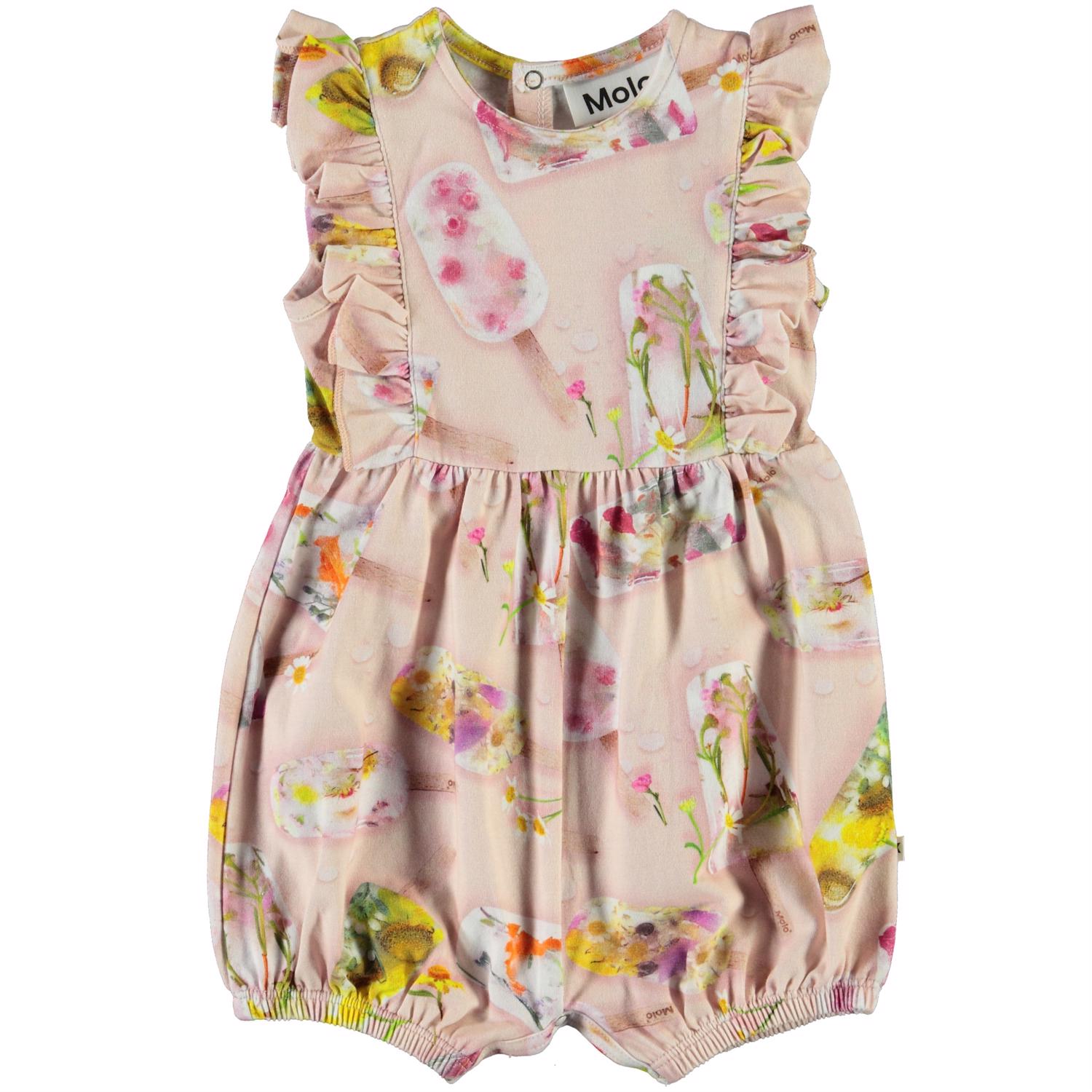 Felicia ist Molos neuer Baby-Anzug, der perfekt für die wärmeren Tage ist. Der Anzug ist hier in rosa mit Eis-Druck. Molo hat selbst diese schönen Blumen zu Eis gefrohren, die zu disem Druck wurden. Felicia hat Rüschen auf der Vorderseite und Knöpfe im Nacken und zwischen den Beinen, die das an- und ausziehen einfach machen. Ecocert Greenlife, certifikationsnr. 197496.
