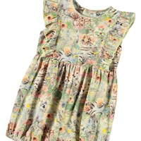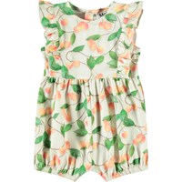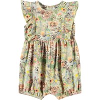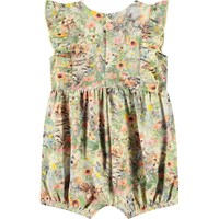 Süßer Öko-Baumwoll-Overall für die Kleinen. Dieser ärmellose Overall verfügt über eine zarte Rüschenverzierung vorne und hinten sowie kurze Beine mit Gummizug. Der Knopfverschluss hinten und zwischen den Beinen erleichtert das An- und Ausziehen. Der Overall hat eine großzügige Passform mit viel Bewegungsfreiheit und einen Druck von Babytieren in einem Blumenbeet.