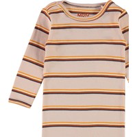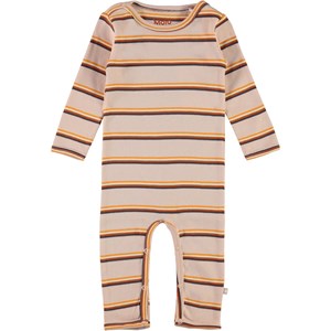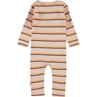 Fenez ist ein Babyanzug mit langen Beinen und Ärmeln in Rosa mit schmalen Streifen. Druckknöpfe an Hals und Beinen erleichtern das An- und Ausziehen.