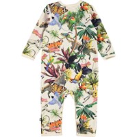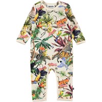 Fenez ist ein Babyanzug mit langen Beinen und Ärmeln und Print eines bunten Fantasy-Dschungels und cremefarbenen Kanten. Druckknöpfe an Hals und Beinen erleichtern das An- und Ausziehen des Anzugs.