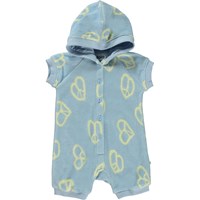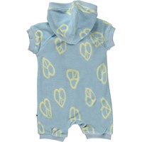 Fidelia ist ein hellblauer Babybody aus Frottee mit Kapuze, kurzen Ärmeln und Beinen. Fidelia hat einen Raglanschnitt an den Ärmeln und einen Knopfverschluss in der vorderen Mitte. Der Anzug hat Rippbündchen an Ärmeln, Beinen und Kapuzenrand und einen Allover-Print mit hellgelben Peace-Zeichen in Herzform.