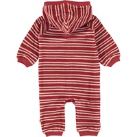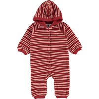 Fidelity ist ein Baby-Einteiler mit Frottee-Kapuze. Der Anzug ist in Rot mit weißen Streifen und hat einen Knopfverschluss auf der Vorderseite.