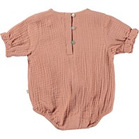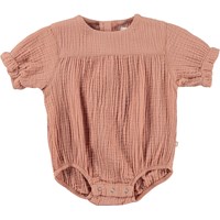 Fie ist ein rosa Baby-Strampler mit kurzen Ärmeln aus 100 % Baumwoll-Musselin. Fie hat Gummizüge an den Ärmeln, die einen schönen Rüscheneffekt erzeugen, und auch Gummizüge an den Oberschenkeln, sodass der Strampler gut um die Windel schließt. Fie hat Druckknöpfe zwischen den Beinen, die das An- und Ausziehen des Overalls erleichtern.
