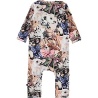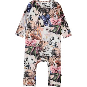 Fiona ist ein Baby-Overall in mit Druck von kleinen Hunden mit einer Schleife um den Hals. Druckknöpfe am Hals und zwischen den Beinen machen das an- und ausziehen einfach. Ecocert Greenlife, certifikationsnr. 197496.