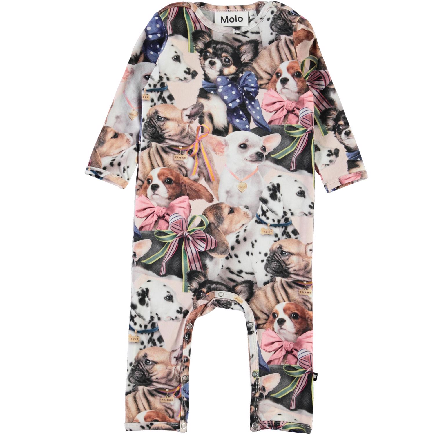 Fiona ist ein Baby-Overall in mit Druck von kleinen Hunden mit einer Schleife um den Hals. Druckknöpfe am Hals und zwischen den Beinen machen das an- und ausziehen einfach. Ecocert Greenlife, certifikationsnr. 197496.