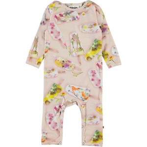 Fiona ist ein Baby-Overall in Rosa mit Druck von Eis. Molo hat selbst diese schönen Blumen zu Eis gefrohren, die zu disem Druck auf dem Anzug wurden. Druckknöpfe am Hals und zwischen den Beinen machen das an- und ausziehen einfach. Ecocert Greenlife, certifikationsnr. 197496.