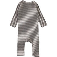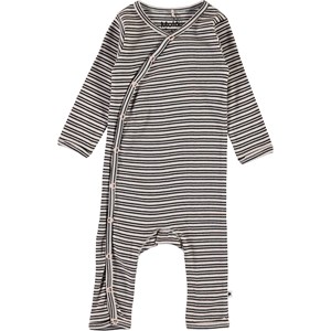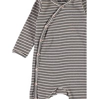 Flora ist ein schwarz-rosa gestreifter Babyanzug in feinem Lochmuster mit langen Ärmeln und Beinen. Der Anzug hat einen schrägen Verschluss auf der Vorderseite mit Druckknöpfen sowie Druckknöpfen zwischen den Beinen, wodurch das An- und Ausziehen des Anzugs erleichtert wird.