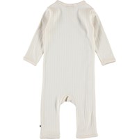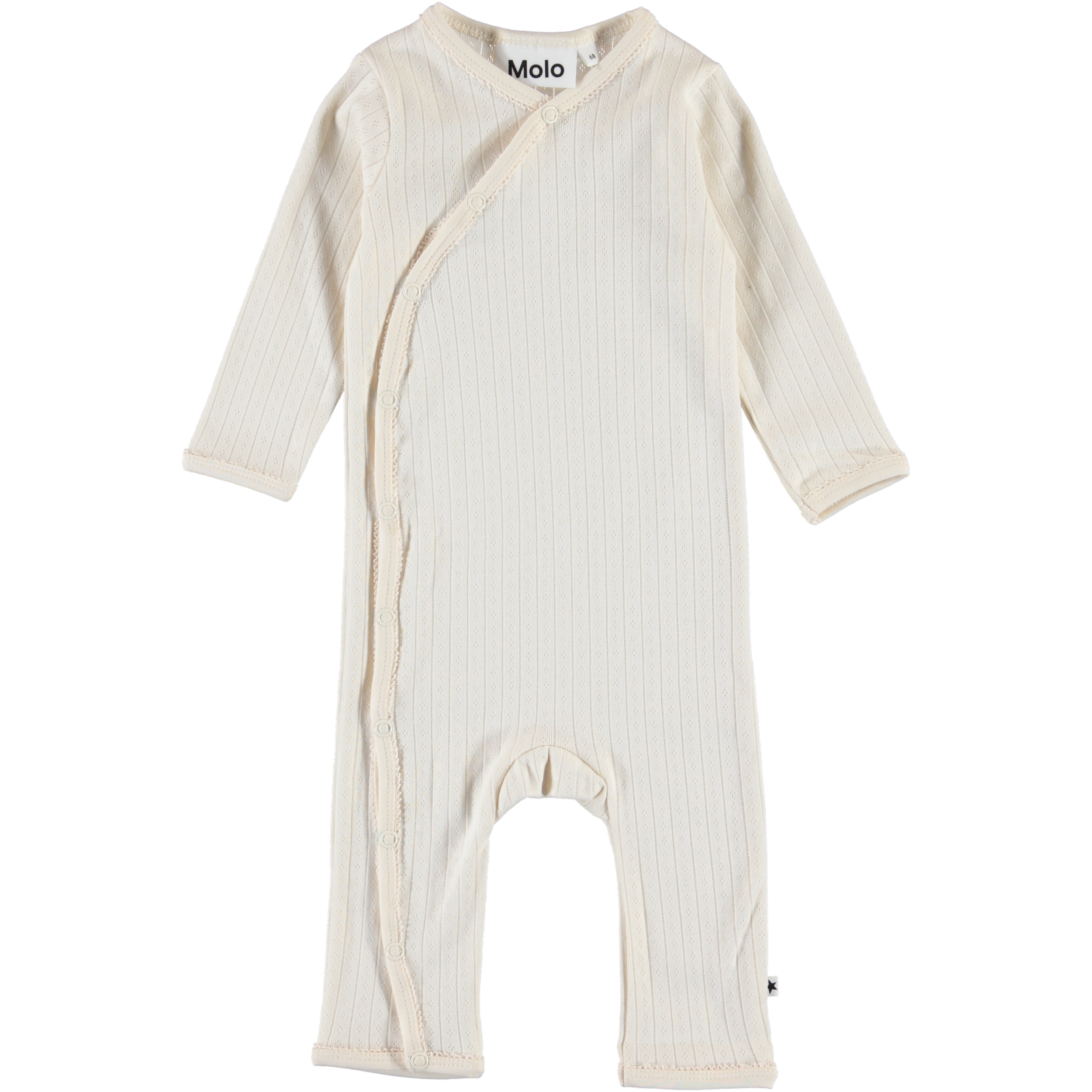 Flora ist ein Babyanzug in feinem Hohlmuster mit langen Ärmeln und Beinen. Der Anzug hat einen schrägen Verschluss über der Vorderseite mit Druckknöpfen sowie Druckknöpfen zwischen den Beinen, wodurch das An- und Ausziehen des Anzugs erleichtert wird.