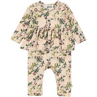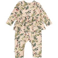 Florie ist ein Babyanzug mit langen Ärmeln und Beinen sowie einem Schößchenrock in der Mitte. Der Anzug wird mit einem Aufdruck aus Brombeerranken gepriesen. Druckknöpfe an den Schultern und zwischen den Beinen erleichtern das An- und Ausziehen des Anzugs.