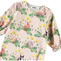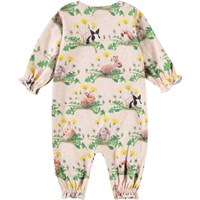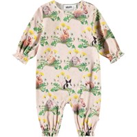 Jumpsuit für die Kleinen aus Öko-Baumwolle. Der Jumpsuit ist weit geschnitten mit langen Ärmeln und Beinen. An den Handgelenken und Knöcheln befindet sich elastisches Material, das eine kleine Rüschenkante hinzufügt. Der Knopfverschluss an einer Schulter und zwischen den Beinen erleichtert das An- und Ausziehen. Der Jumpsuit ist mit einem Allover-Print von Tierbabys in einem Blumenbeet versehen.