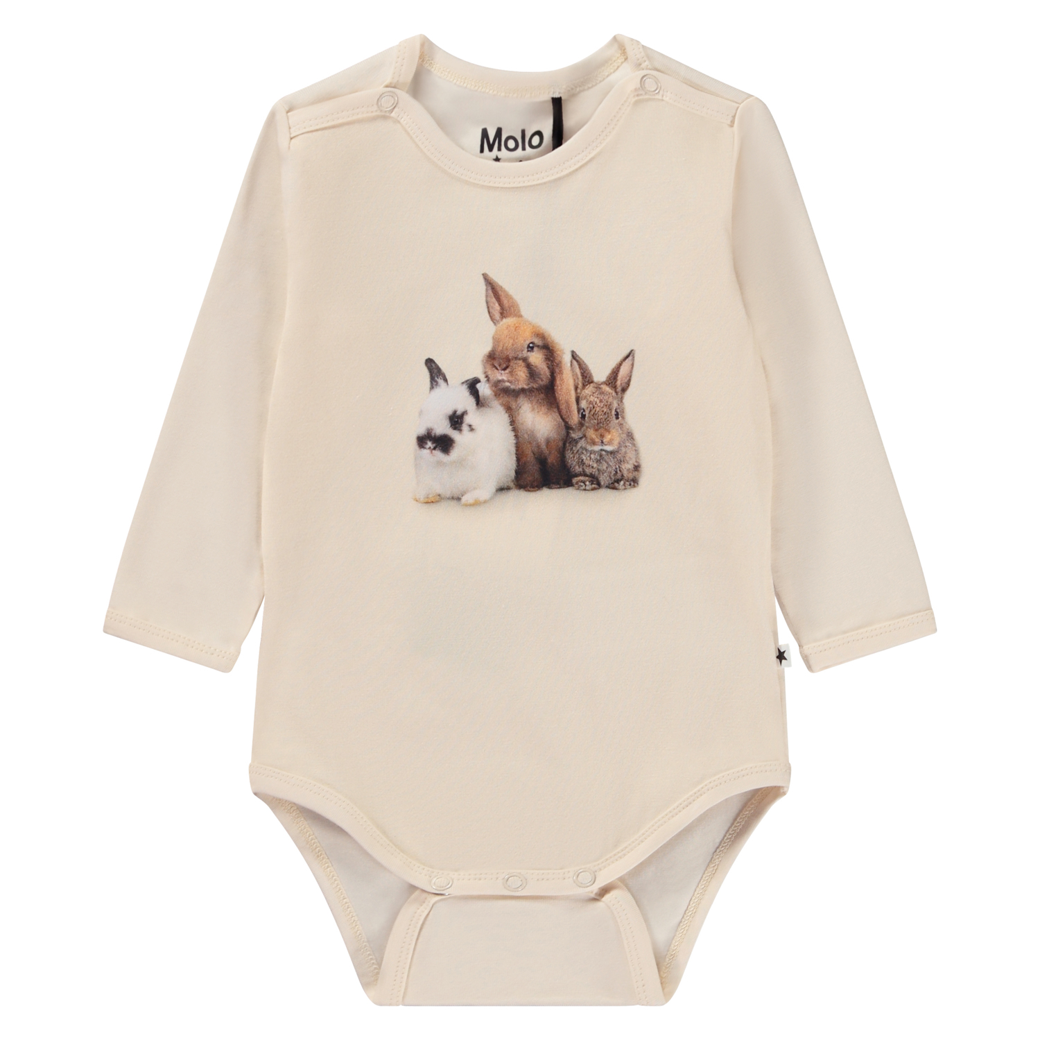 Rosafarbener Babybody mit einem Aufdruck auf der Vorderseite einer Gruppe von Kaninchenfreunden. Dieser Body besteht aus 100% Baumwolle, hat lange Ärmel und Druckknöpfe am Kragen und zwischen den Beinen, die das An- und Ausziehen des Bodys erleichtern. Kombinieren Sie evt. diesen Body mit der Hose Seb im gleichen Aufdruck.