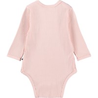 Rosa, langärmliger Body für die Kleinen aus Bio-Baumwollripp. Er hat schöne Einfassungen und Druckknöpfe an den Schultern und zwischen den Beinen für einfaches An- und Ausziehen.