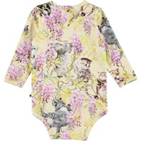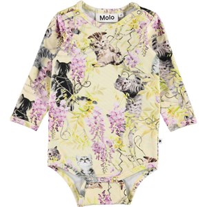 Foss ist ein hellgelber, langärmeliger Babybody mit Aufdrucken von Kätzchen, die in einer Glyzinie spielen. Druckknöpfe am Hals und zwischen den Beinen erleichtern das An- und Ausziehen des Bodys.
