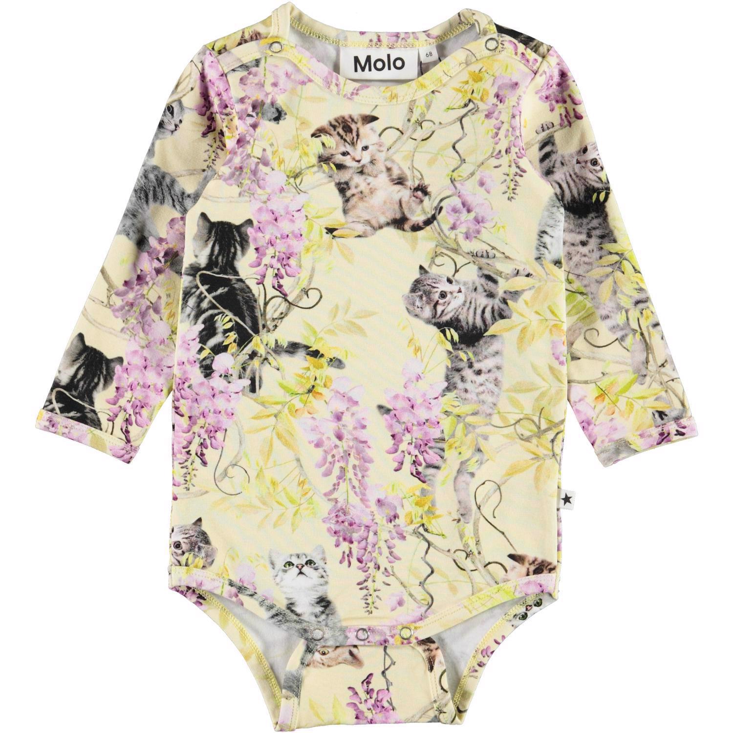 Foss ist ein hellgelber, langärmeliger Babybody mit Aufdrucken von Kätzchen, die in einer Glyzinie spielen. Druckknöpfe am Hals und zwischen den Beinen erleichtern das An- und Ausziehen des Bodys.