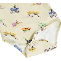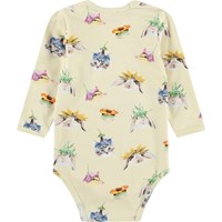 Langärmeliger, gelber Body für die Kleinen aus Bio-Baumwolle mit Tiermuster. Er hat schöne Einfassungen und Druckknöpfe an den Schultern und zwischen den Beinen für einfaches An- und Ausziehen.