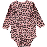 Foss ist ein rosa Babybody mit langen Ärmeln und Leopardenmuster. Druckknöpfe am Hals und zwischen den Beinen erleichtern das An- und Ausziehen des Bodys.