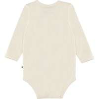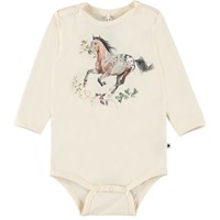 Foss ist ein heller, langärmeliger Babybody mit einem Aufdruck eines gezeichneten Pferdes mit Pflanzen drumherum. Druckknöpfe am Hals und zwischen den Beinen erleichtern das An- und Ausziehen des Bodys.