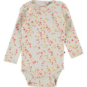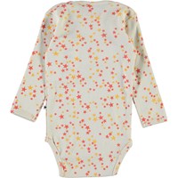Foss ist ein langärmliger Baby-Body in Beige mit Druck von roten und gelben Mini-Sternen. Druckknöpfe am Hals und zwischen den Beinen machen das an- und ausziehen einfach. Ecocert Greenlife, certifikationsnr. 197496.