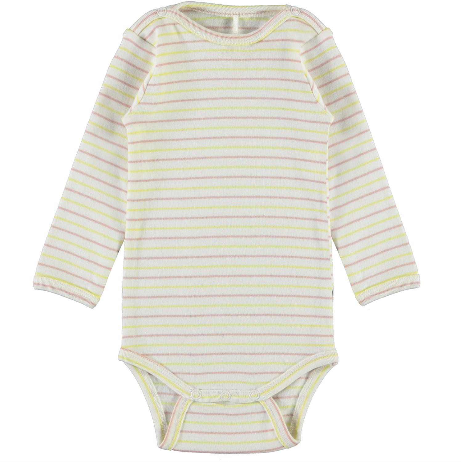 Foss ist eine langeärmeliger Baby-Body mit schmalen gelben und rosa Streifen. Druckknöpfe am Hals und zwischen den Beinen machen das an- und ausziehen einfach macht. Ecocert Greenlife, certifikationsnr. 197496.
