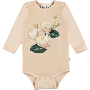 Foss ist ein langärmeliger Babybody in Pink mit einem Aufdruck von Seerosen auf der Vorderseite. Druckknöpfe am Hals und zwischen den Beinen erleichtern das An- und Ausziehen.
