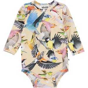 Foss ist ein hellgelber Babybody mit Prints verschiedener Vögel. Foss hat einen Druckknopf im Kragen und zwischen den Beinen, der das An- und Ausziehen des Bodys erleichtert.