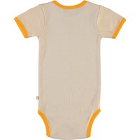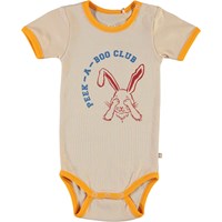 Fossie ist ein rosa Baby-Body mit Druck von Kaninchen und den Text: "Peek-a-boo-club" auf der Vorderseite, und einem orangen Kantenband. Der Body hat Knopfverschluss zwischen den Beinen. Ecocert Greenlife, certifikationsnr. 197496
