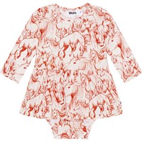 Cremeweißer Babybody aus Öko-Stretch-Baumwolljersey. Der Body hat einen Rundhalsausschnitt, einen Schößchenrock, weiße Kanten und Druckknöpfe am Hals und zwischen den Beinen, die das An- und Ausziehen des Bodys erleichtern. Der Body ist mit einem roten Allover-Print aus handgezeichneten, wunderschönen Pferden versehen.