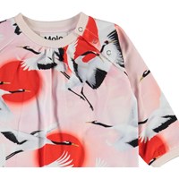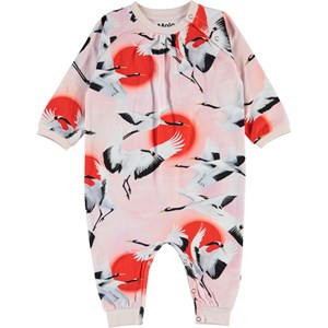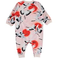 Francine ist ein Baby in Rosa mit einem Druck von fliegenden Kranichen. Der Anzug hat guten Raum, und ist am Hals ist leicht drapiert. Druckknöpfe am Hals und zwischen den Beinen erleichtern das An- und Ausziehen..