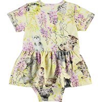 Frannie ist ein hellgelber Babybody mit Aufdrucken von Kätzchen, die in einer Glyzinie spielen. Frannie hat kurze Ärmel, einen Schößchenrock und Druckknöpfe an einer Schulter und zwischen den Beinen, die das An- und Ausziehen erleichtern.