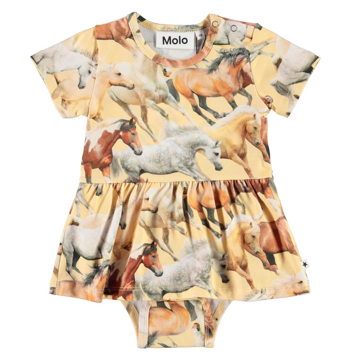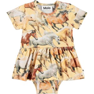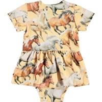 Frannie ist ein gelber Babybody mit Pferdeprint. Frannie hat kurze Ärmel, einen Schößchenrock und Druckknöpfe an einer Schulter und zwischen den Beinen, die das An- und Ausziehen erleichtern.