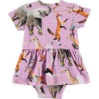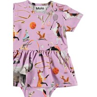 Kurzärmeliger lila Body mit Druck verschiedener Tiere die Sport treiben. Der Körper einen Schößchenröck sowie Druckknöpfe am Hals und zwischen den Beinen, die das An- und Ausziehen erleichtern.