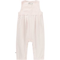 Rosa Overall für die Kleinen aus Bio-Baumwolle mit Streifen. Es ist ein ärmelloses Modell mit Knöpfen, langen Beinen und Druckknöpfen zwischen den Beinen für einfaches Anziehen.