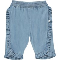 Sallie ist eine Babyhose aus hellblauem Denim. Die Hose hat feine Rüschenkanten, sowie einen elastischen Bund.