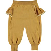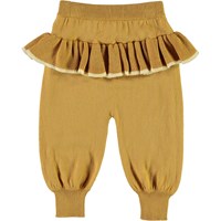 Sanne sind ein Paar honigfarbene Babyhosen in gestrickter Baumwolle. Die Hosen haben eine Rüschenkante auf der Rückseite. Kombiniere die Hose mit der passenden Strickjacke.