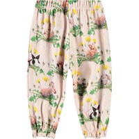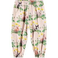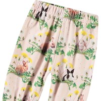 Hosen aus Öko-Baumwolljersey für die Kleinen. Die Hosen haben einen elastischen Bund und an den Knöcheln, was eine niedliche Rüsche ergibt. Sie sind mit einem Druck von Hasen und Löwenzahn versehen.