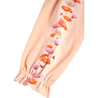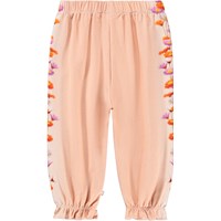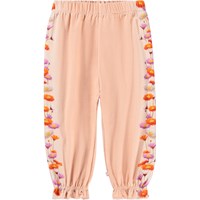 Hosen für die Kleinen aus Öko-Baumwolljersey. Die Hosen sind rosa und haben einen Blumendruck entlang der Beine. Die Hosen haben einen elastischen Bund und an den Knöcheln entsteht eine hübsche kleine Rüsche.