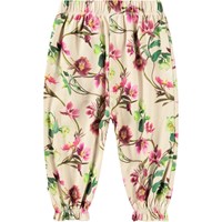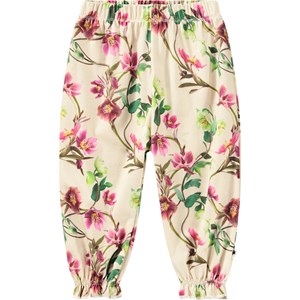 Off-weiße Hosen aus Öko-Baumwolljersey für die Kleinen. Die Hosen haben einen gerippten Bund und Gummizüge an den Knöcheln, die eine niedliche kleine Rüsche erzeugen. Sie sind mit einem mehrfarbigen Allover-Druck von Weihnachtsrosen in weißen und hellrosa Tönen versehen, die wunderschön mit ihren grünen Blättern verwoben sind.