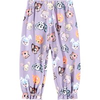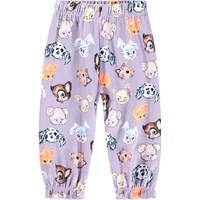 Hosen für die Kleinen aus Öko-Baumwolljersey. Die Hosen sind hell-lila und haben einen Aufdruck von gezeichneten Tieren. An der Taille und den Knöcheln haben die Hosen elastische Bündchen, die eine hübsche kleine Rüsche erzeugen.