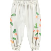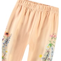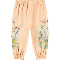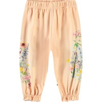 Hosen aus Öko-Baumwoll-Jersey für die Kleinen. Die Hosen haben einen elastischen Bund und an den Knöcheln, was eine niedliche Rüsche ergibt. Sie sind hellorange mit einem Blumenmuster entlang der Beine.