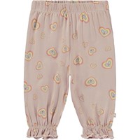 Rosafarbene Babyhose mit Druck von lächelnden Herzen. Die Hose hat einen elastischen Bund und Beinabschlüsse mit Falteneffekt.